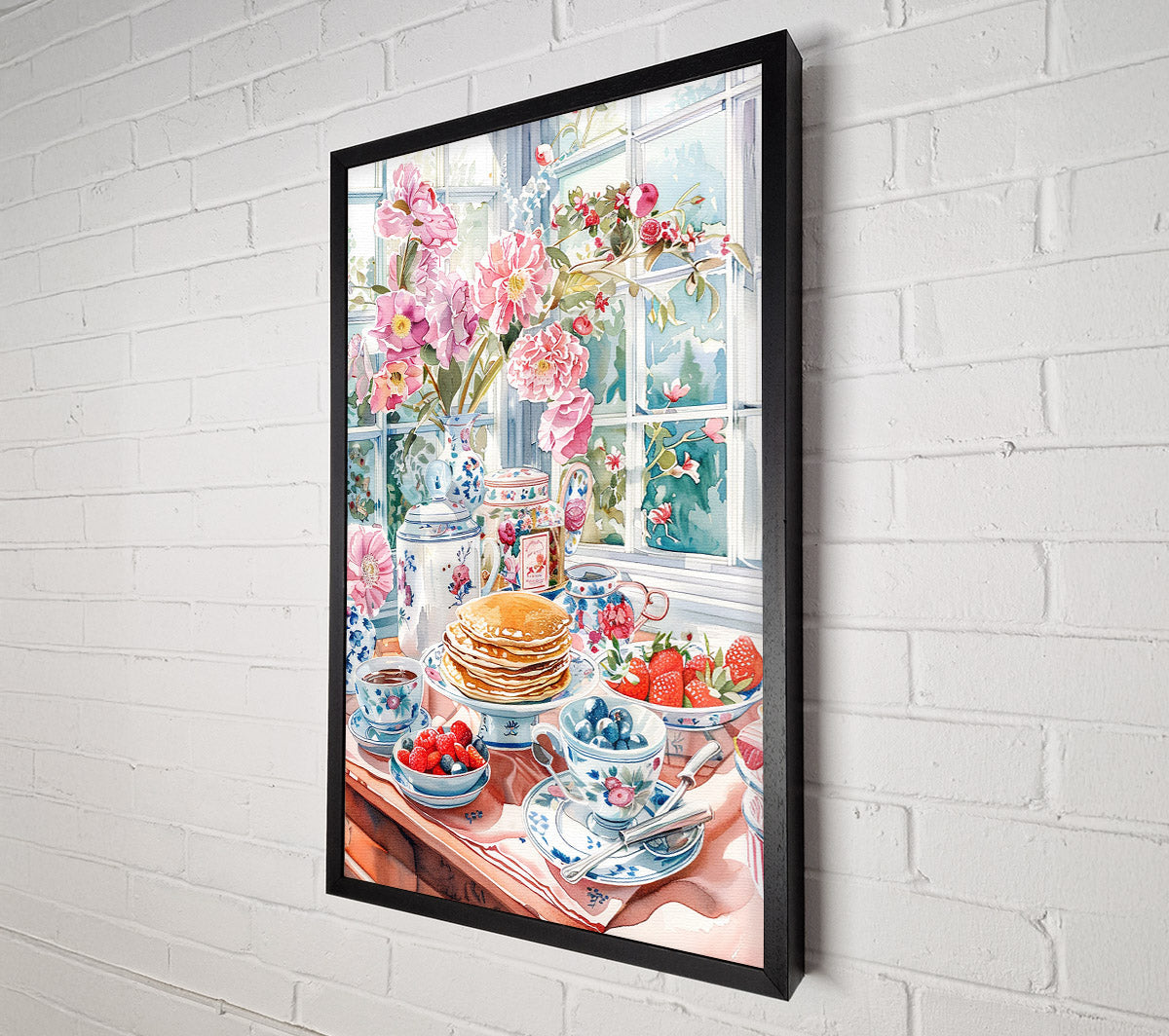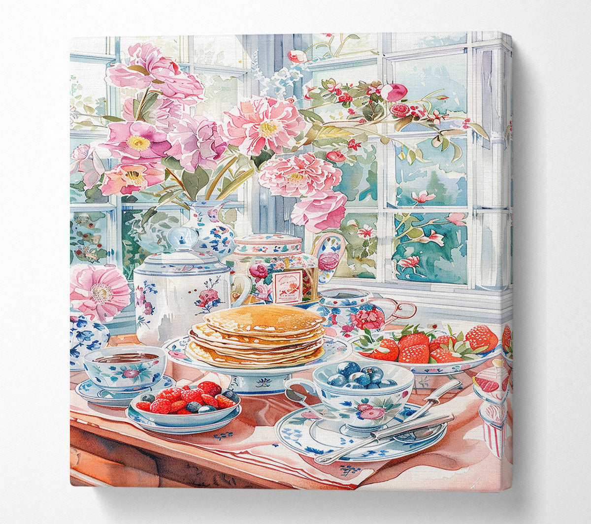 A Still Life With Flowers And Pancakes Canvas Wall Art -